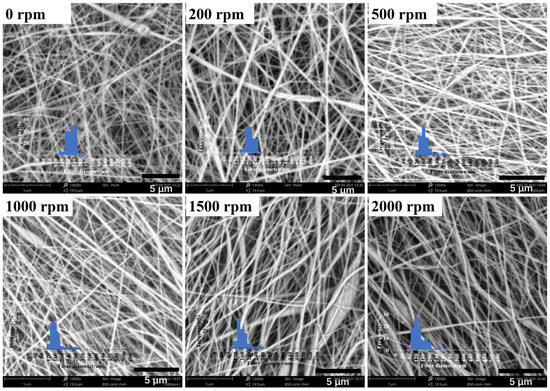 SEM images and nanofibers diameter distribution and nanofiber mean diameter distribution of PVDF nanofibers for different rotating speeds (C) (25 w/v% PVDF, DMF/acetone = 2/3, TCD = 25 cm, FR = 1 mL/h, V = 20 kV, rotating speed: 0–2000 rpm).