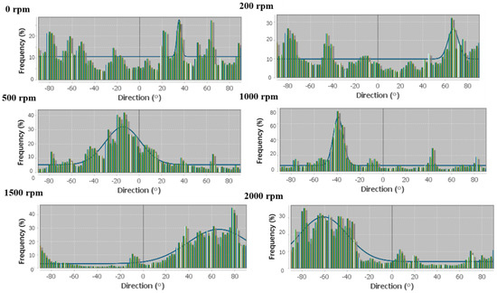 The orientation distribution of PVDF nanofibers for different rotating speeds (25 w/v% PVDF, DMF/acetone = 2/3, TCD = 25 cm, FR = 1 mL/h, V = 20 kV, rotating speed: 0–2000 rpm).