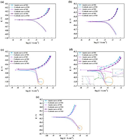 Figure 2 shows the comparison of the polarization curves measured by three measuring methods in five solutions including HCl, H2SO4, NaCl, Na2SO4, and NaOH. For acidic and alkaline solutions, Figure 2a,b, the shapes of the three polarization curves are almost the same in appearance, while for neutral and alkaline solutions, there are huge differences between the three polarization curves, especially for the cathodic curves. It can be seen from Figure 2c–e that horizontal lines (green circles), just like tails, are observed in the cathodic regions of the polarization curves measured by M1 compared with those by M2 and M3. The maximum values of cathodic current densities are 131.3 μA·cm−2 (M1), 48.3 μA·cm−2 (M2), and 39.5 μA·cm−2 (M3) for the NaCl solution, 465.4 μA·cm−2 (M1), 63.4 μA·cm−2 (M2), and 61.2 μA·cm−2 (M3) for the Na2SO4 solution, and 10.8 μA·cm−2 (M1), 8.0 μA·cm−2 (M2), and 7.4 μA·cm−2 (M3) for the NaOH solution, respectively. There are big differences between the current densities for M1 and those of M2 or M3, especially for the NaCl and Na2SO4 solutions. Too large cathodic current density must influence the surface states of coupons and further change the cathodic and anodic processes. The anodic polarization curve with an active-passive region is observed in Figure 2d, which is very different from those measured by the other two methods because of the highest value of the initial cathodic current. Similarly, the cathodic curve of M1 also shows some differences compared with the curves by M2 and M3.