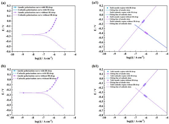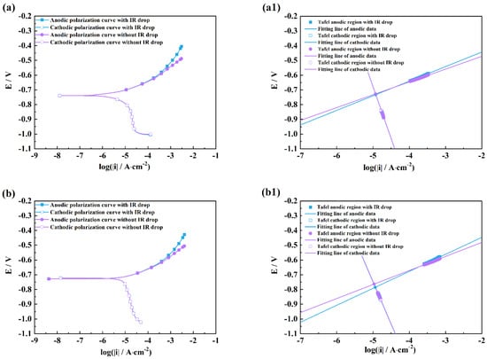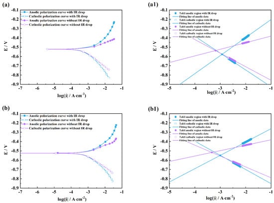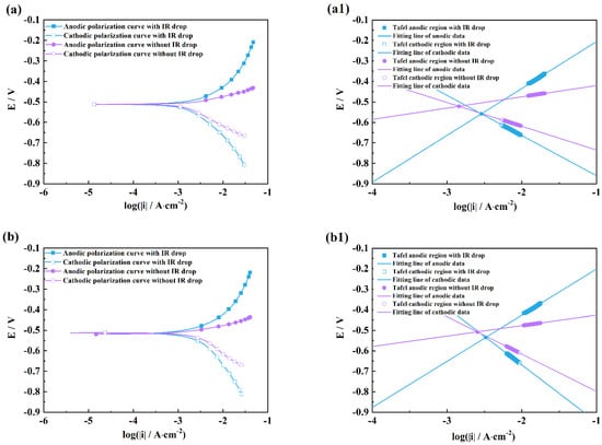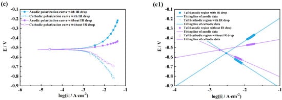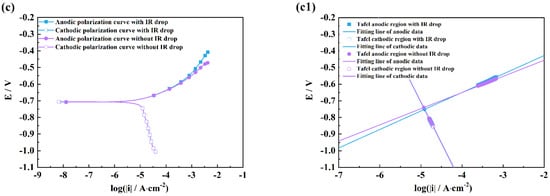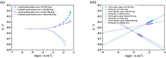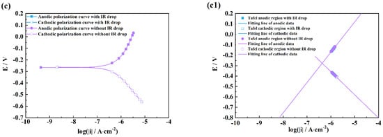 Figure 4, Figure 5, Figure 6 and Figure 7 show the comparison plots of polarization curves with and without an IR drop under three measurements and linear fitting plots of Tafel regions, and the calculated Ecorr, icorr, ba, and bc values are listed in Table 3, Table 4, Table 5 and Table 6 together with the corresponding fitting Adj. R2 values [21,22,23,24,25].