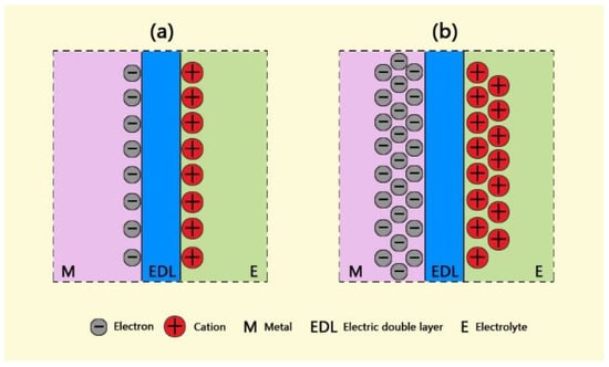 As is well known, there is an electric double layer at a metal–electrolyte interface when the metal electrode is immersed in an electrolyte. Electrons are usually accumulated on the metal side, and positive-charged ions are on the solution side. The charge quantities of electrons and cations are the same when the electrode reaches equilibrium, as shown in Figure 8a. As the electrode is applied by a cathodic current or potential, as in Figure 8b, the electrons quickly accumulate on the side of the metal, and the cations in a solution begin to move towards the electrolyte side of the EDL under the effect of electrostatic attraction. The amounts of electrons are much larger than those of cations because of the faster migrating rate of electrons at the beginning of polarization. Only when re-reaching the equilibrium of the electrode do the quantities of positive and negative charges become the same on the both sides of the EDL.