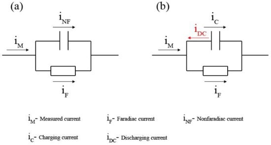 As shown in Figure 9a, the polarization currents measured (iM) are divided into two parts according to Equation (12): faradaic current (iF), which is used for the reaction of electrodes, and nonfaradaic current (iNF), which is used for the charging of EDLs, called the charging current (iC). When a small polarization potential is applied to the electrode, the equilibrium of charges between the sides of the EDL is easily reached; however, a large amount of electrons accumulate on the steel–solution interface if the applied potential is large enough, and there are not enough cations to quickly balance the negative charges, as shown in Figure 8b. In such cases, the discharging current (iDC) is formed, and there is a relationship following Equation (13).