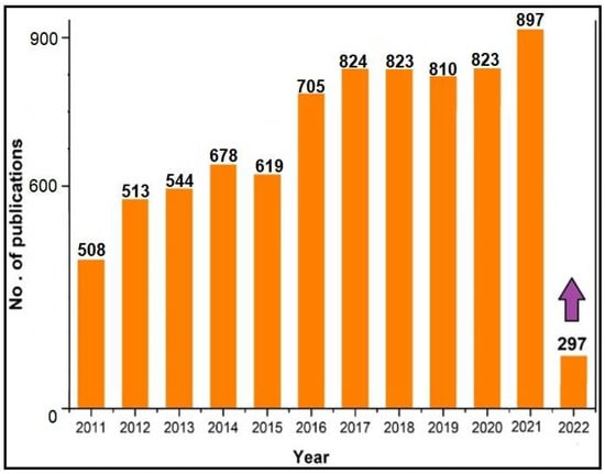 Equation (1) shows that increasing the gas turbine’s inlet temperature can improve its thermal efficiency []. Raising the turbine’s inlet temperature sets an immediate requirement on the materials working in the gas turbine’s hot regions, where the temperatures approximate the range of 1500 °C []. Here, the temperature is higher than the melting point of the most reliable working materials in gas turbines now, such as nickel-based superalloys. When rising the temperature of hot gas inside the turbine inlet, it is more important to control the temperature and protect the turbine component from degradation. Hence, it is feasible to use outside insulation of the surface material and an internal cooling system for turbine components. This internal cooling system is used to restrict the volume of air and control the heating temperature without decreasing the gas turbine’s thermal efficiency. When a quantity of air higher than 8% is utilized for cooling purposes for the turbine, the main benefit of this cooling system is to regulate the working temperature and increase the mechanical and thermal efficiency of turbine blades []. Coating quality advancements can improve work performance and reliability []. The researchers’ foremost challenge issues in surface coating are how to improve the thermal stability of the ceramic powder material at a higher working temperature to provide a better insulation property for the substrate metal []. The various approaches and synthesis mechanisms can be used for materials processing in other applications []. The details of papers published on thermal barrier coatings have been fetched from scopus.com (accessed on 23 August 2022) and presented in Figure 2. Researchers are focusing on the challenges associated with thermal barrier coatings, and advancements are still going on in this field.