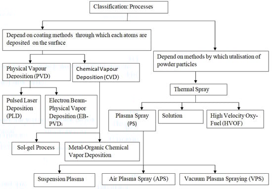 As shown in Figure 5, it offers a specific classification of processing techniques and the necessary process employed to deposition TBCs on the substrate metal, which has been mentioned in the following paragraphs. In the field of thermal spray, thermal plasmas are employed in atmospheric plasma spray (APS), suspension plasma spraying (SPS), solution precursor plasma spray (SPPS), Plasma Spraying –Physical Vapour Deposition (PS-PVD) vacuum plasma spray (VPS), low-pressure plasma spray (LPPS), and controlled atmospheric plasma spray (CAPS) methods.
