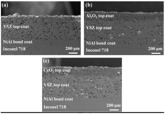 Low magnification FE-SEM images show the plasma-sprayed cross-sectional surface (a) NiAl/YSZ, (b) NiAl/YSZ/Al2O3 and (c) NiAl/YSZ/Al2O3/CeO2 [].