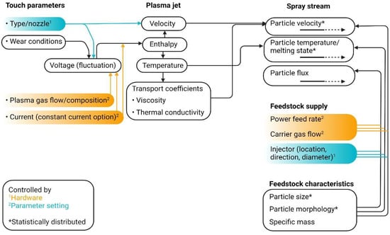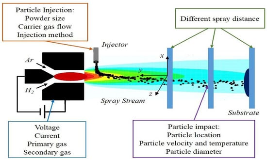 The following sections extensively discuss atmospheric plasma spray (APS) because it is a standard coating method that can model typical thermal spray processes. Because of the relative amount of momentum supplied to the in-flight particles, plasma jet flow alters the trajectories of feedstock [,,].