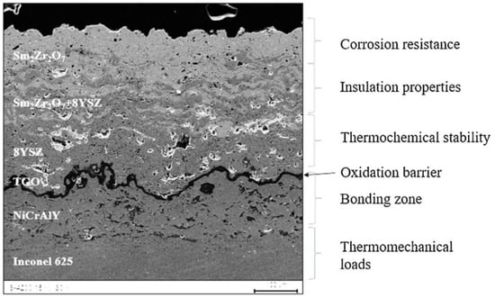 Figure 11 represents every layer’s purpose inside the functional zones of this functionally graded coating (FGC) technique. In hot corrosion conditions, the stimulation decomposed for the Sm2Zr2O7 + 8YSZ way into the form of APS for the double ceramic layer (DCL) and functionally graded system (FGS) modes was examined. This investigation was to distinguish surface methods in a liquid sodium sulfate Na2SO4 environment that occur throughout the corrosion of FGC based on samarium zirconate and zirconium oxide with ratios 25/75, 50/50, and 75/25. After experimentation, the selective breakdown of samarium zirconate in the 50 8YSZ + 50 Sm2Zr2O7 composition that system gave better corrosion resistance compared to others [].