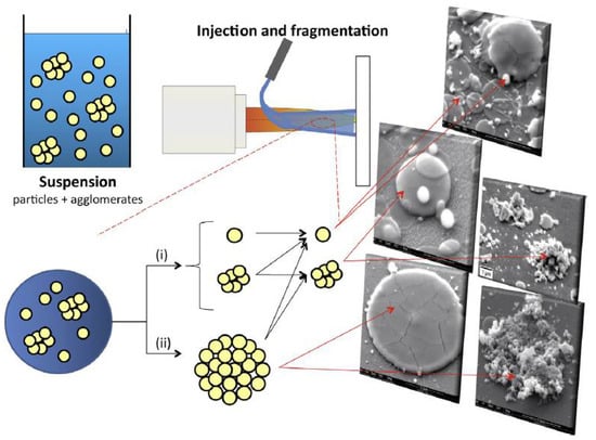 Figure 13 shows the system used for the injection and fragmentation of the molten powder grains during deposition on the substrate material. The single and agglomerated powder grains that remain in the suspension are delivered immediately and melted through the plasma jet. Single powder grains provide very tiny lamellae or sub-micrometric globular characteristics that have not flattened [].
