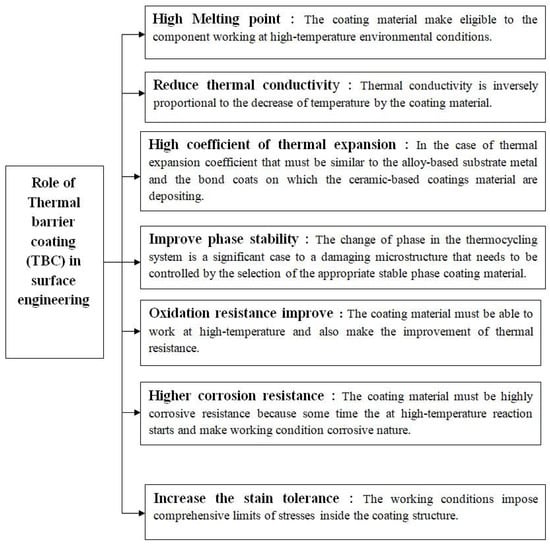 TBCs are coated processes used for intricate surface material systems that are useful for gas turbine engines implemented in hot regions. This multi-layered coated surface has a formation where the top coating layer comprises a lower thermal conductivity ceramic and thermal insulation from hot burning gases []. The schematic is shown in Figure 3. At maximum engine power, the modern turbine inlet temperature (TIT) of state-of-the-art jet plane turbines reaches a value of approximately 1500 °C. The component temperature level is higher than the maximum operating temperature of YSZ TBCs, which is around 1300 °C. Underneath the topcoat is a bond coat that contributes a vital role for bonding effect between the ceramic material and base metal for protecting turbine components against oxidation and corrosion effect at high temperatures and crossover working environment.