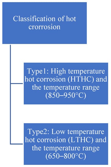The rapid oxidation of materials at high temperatures caused by a thin layer of dissolved salt deposits is hot corrosion []. Sulfur is present in lower-grade fuels, where it produces SO2 on combustion and is slightly oxidized to SO3. Sodium chloride (NaCl) combines with water vapor and SO3 at combustion temperature to form sodium sulphate (Na2SO4), which has a melting point of 884 °C [].