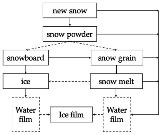 The phenomenon of snow and ice on roads often occurs in low-temperature climate and large-area snowfall. The Institute of cryogenic science of Hokkaido University observed the ice and snow on the road surface, and proposed the snow on the roads into seven types: new snow, snow powder, snow grain, snowboard, ice, ice film, and snow melt [16]. Under the action of various methods behaviors (vehicle loads, chemical treatment and thermal absorption), the snow type changes frequently on the road, and the change of snow state was shown in Figure 1.