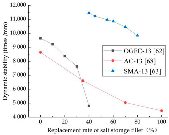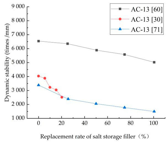 In accordance with Chinese technical specification JTG F40-2004 [69], high temperature stability of asphalt mixtures with salt storage filler was evaluated by rutting test [70], which was expressed as dynamic stability (DS). According to the comparative studies [30,60,71], the influence of salt storage filler on AC-13 mixture was shown in Figure 4.