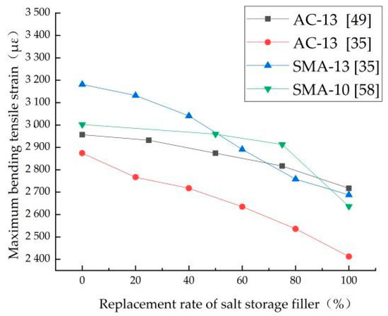 The low-temperature crack resistance of the mixture with salt storage filler was evaluated using the ultimate flexural strain value (εB), measured by bending beam text at −10 ± 0.5 °C, as shown in Figure 6 [35,49,58].