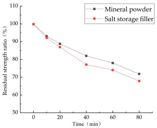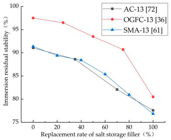 In order to study water stability of different types of mixtures with the salt storage filler, the immersion Marshall test was carried out, the residual stability (RS) was measured, as shown in Figure 8 [36,61,72].