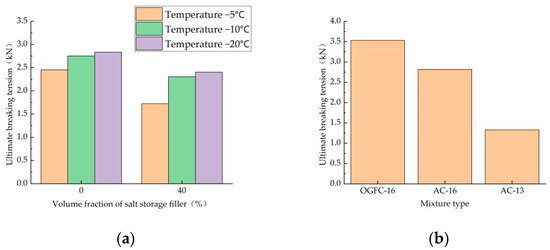According to the results of testing the ultimate breaking force in Figure 10a, it was found that under the same temperature, the ultimate breaking force of the salt storage mixture was less than the ordinary mixture. It indicated that the salt storage pavement could effectively reduce the bonding force between ice and the mixture. The ultimate breaking force of salt storage mixture at −5 °C was 27.8% lower than ordinary mixture, 11.7% lower at −10 °C and 10% lower at −20 °C. It indicated that the effect of salt storage filler decreased with the decrease of temperature. According to the results of Figure 10b, OGFC-16 was 23% higher than AC-16. It illustrated that the grading type would affect the bonding force between the mixture and ice and the bonding force between open graded mixture and ice was greater than dense graded mixture. Comparing AC-16 and AC-13, it could be seen that the adhesion of AC-16 was 53% greater than that of AC-13. It illustrated that the nominal maximum particle size would also affect the adhesion between the mixture and ice. In addition, the adhesion increased with the increase of the nominal maximum particle size. Therefore, the ice pavement bonding strength is related to temperature, salt storage, nominal maximum particle size and type of mixture [88]. However, there is no unified test standard for the ice melting rate test. Therefore, it is suggested to supplement the qualitative evaluation index later.