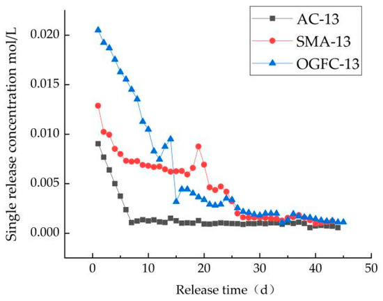 According to the data comparison in Figure 8, it was found that the RS decline of OGFC-13 with salt storage filler was more obvious, compared with AC-13 and SMA-13. It demonstrated that the water stability of OGFC-13 with salt storage filler was lower than AC-13 and SMA-13. The reason is that the change of volume index and the structural composition of mixture. There is a causal relationship between the change of volume index of salt storage asphalt mixture and the change of water stability performance [78]. During the immersion Marshall test, the 60 °C water bathing and 48 h bathing time accelerated the release of salt, resulting in poor adhesion between asphalt and aggregate. Therefore, it led to the loose internal structure of salt storage asphalt mixture and larger void ratio [79,80]. Due to the structural composition of OGFC-13, large characteristic void ratio makes easier for water to enter the interior of mixture. When water enters the interior of the salt storage asphalt mixture through the open pores, the salt contained in the salt storage filler is eroded and dissolved. In addition, then the asphalt mortar aggregate will form porous structure, resulting in more serious asphalt film peeling [77,81]. Therefore, water stability of OGFC-13 with salt storage filler declines more significantly than AC-13 and SMA-13.