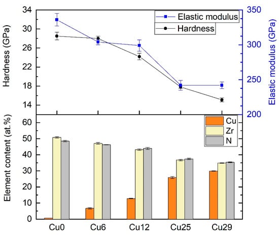 The mechanical properties of the ZrN-Cu coatings showed a clear relation between microhardness and Cu content. This is demonstrated by Figure 1. They show that incorporating ~30 at.% Cu to ZrN resulted in a hardness decrease from 28.5 ± 0.8 GPa to 15.1 ± 0.4 GPa. The same trend is seen for the elastic modulus, which exhibited a fall from 336 ± 9 GPa to 242 ± 5 GPa. This will be discussed further in the microstructure section. Other authors have reported a similar trend for mechanical properties when increasing the additive element to ZrN or TiN [39,40,41]. However, Musil et al. [30] observed an initial enhancement in mechanical properties when the Cu content was low (<2 at.%), followed by a gradual decrease. The same was reported by Zeman et al. [42], where samples with 1–2 at.% Cu exhibited higher hardness.