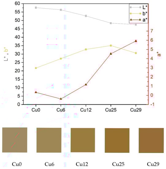 The color of the coatings gradually became reddish following increases in Cu content. Figure 2 shows that L* reached its lowest value when the Cu content was highest (Cu29), implying that increasing the copper content led to the darkening of the coating. Furthermore, more Cu content increased the a* value, indicating a more reddish color. b* (the level of yellow color) increased with Cu content and reached its peak at Cu25, followed by a drop when the Cu content increased beyond 25 at.%.