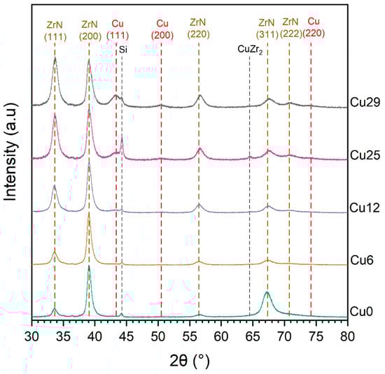 The XRD patterns of the coatings are shown in Figure 3. The vertical dashed lines indicate the reference positions of ZrN and Cu phases according to the PDF cards 00-035-0753 and 00-004-0836, respectively. The pattern obtained for the Cu0 sample exhibited only ZrN reflections with dominant (200) and (311) reflections. However, Cu incorporation led to a change in the preferential growth orientation of ZrN. This change occurred at the expense of mostly eliminating the (311) reflection. ZrN peaks shifted to higher diffraction angles with Cu incorporation. The peak shift implies a distortion of the lattice induced by the dissolution of Cu in ZrN. The ZrN lattice likely contracted due to the substitution of Zr by Cu atoms as Cu has a smaller atomic radius than Zr [43]. Lattice contraction means smaller interplanar spacing and, consequently, higher diffraction angles. It is evident that the degree of peak shift should correlate with the amount of incorporated Cu, i.e., greater Cu amounts lead to higher 2θ positions of ZrN peaks.