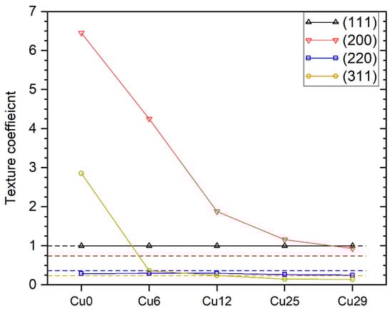 Texture coefficients of the ZrN-Cu coatings. The dashed lines indicate the relative intensity of ZrN diffractions in PDF card 00-035-0753.