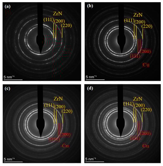 To further analyze the microstructure, a TEM analysis was performed to obtain the Selected Area Electron Diffraction (SAED) patterns. Figure 6 presents the SAED patterns of Cu6, Cu12, Cu25, and Cu29 samples. The SAED pattern of Cu6 shows only ZrN reflections, and no Cu ring is observed. The emergence of a Cu(111) ring, albeit faintly, in the SAED pattern of Cu12 supports the idea of the formation of a separate crystalline Cu phase. In the case of Cu25, another diffraction ring corresponding to Cu(200) appears, and with a further increase in copper content to ~29 at.%, the Cu(200) ring becomes slightly stronger.