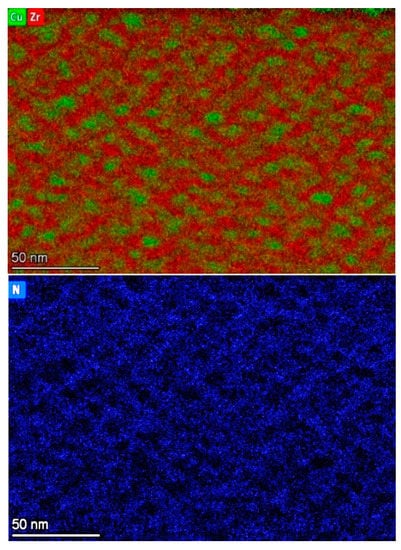 A TEM-EDS map of the Cu29 sample (Figure 7) shows the dispersion of Zr, N, and Cu in the coating. In this map, the green color is assigned to Cu and red color is assigned to Zr. The images show almost no N in Cu accumulation sites, which is likely due to the lack of chemical bonds between them.