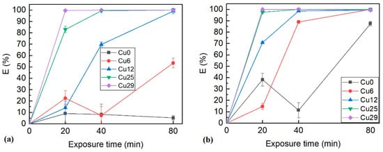 The bactericidal activity of the surface is characterized by its efficiency at killing bacteria (E) settled on the surface according to Equation (1). Figure 8 shows the bactericidal efficiency of ZrN-Cu coatings with different Cu concentrations against E. coli and P. aeruginosa. The contact time of the bacteria with the surface varied, either 20, 40, or 80 min. As evident in this figure, the bactericidal efficiency of the coatings strongly depended on the Cu concentration. In shorter exposure times, a strange behavior was sometimes observed, as seen in Figure 8. A larger sample set would determine the actual course for each sample type. This trajectory was not critical as it happened only in low copper amount containing samples, which did not show sufficient bactericidal efficiency and are unsuitable for self-sanitizing applications. The values of bactericidal efficiency may differ depending on the species used for the test. These differences are often attributed to the thickness and composition of the bacteria’s cell wall and the bactericidal agent’s ability to penetrate it [61]. As seen in Figure 8, E. coli is more resistant than P. aeruginosa. For instance, the copper amount had to be at least 25 at.% to kill almost all E. coli colonies in 40 min. However, in the case of P. aeruginosa, 12 at.% Cu sufficed to obtain a bactericidal efficiency of ~100%. Other authors have reported similar results. For instance, Musil et al. [30] observed 100% bactericidal efficiency of ZrN-Cu coatings containing Cu > 10 at.% after 5 h exposure time.