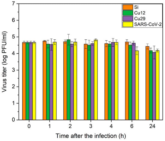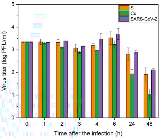 To assess the ability of pure copper to inactivate SARS-CoV-2, Cu coating was deposited by magnetron sputtering and its virucidal activity was tested. Figure 10 shows a significant virucidal activity of copper coating on a Si wafer substrate against the SARS-CoV-2 virus, which agrees with other published data, for example, in [69].