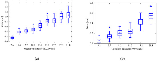 Figure 1 depicts the connection between wheel wear and operating distance for all 64 wheels in 8 cars, including the maximum, minimum, median, abnormal, and quantiles of wear depth. According to the statistical results of two high-speed lines, the wheel wear gradually increases and presents an approximately linear relationship. Significantly, the error of wheel wear gradually increases with operation distance. In the Line A, the average wear rate is 0.05 mm/10,000 km, the maximum wear and the average wear are about 1.5 mm and 1.1 mm at 218,000 km, respectively.