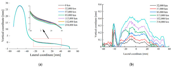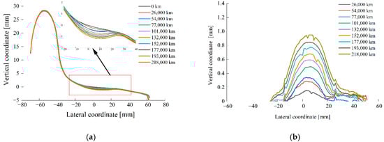 The worn profiles of a wheel with Line A are shown in Figure 2a. As shown in Figure 2b, the firstly-measured wheel profile be the reference, the profiles tested after different operation distance is subtracted from the reference profile in the normal direction to obtain the wear distribution. The calculations demonstrate that when hollow wear begins in the wheel, the dominant wear concentrated on the lateral position between −20~30 mm. At lateral positions between −35 and −45 mm, flange wear occurs with a coordinate system defined at the nominal rolling radius. Noticeably, the flange wear has not been observed for Line A.