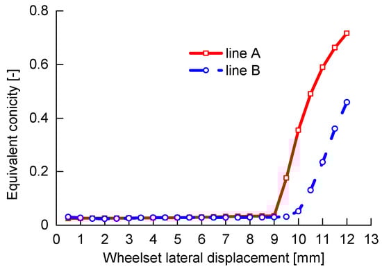 Based on the UIC 519 standard, the equivalent conicity is determined here using the measured profiles [22]. The equivalent conicity of two lines after reprofiling the wheel are compared, as shown in Figure 5. Due to the thin flange of the Line B, the wheel-rail gap increases, the wheel enters the flange root, and the equivalent conicity begins to increase gradually when the wheelset lateral displacement reaches 10 mm.