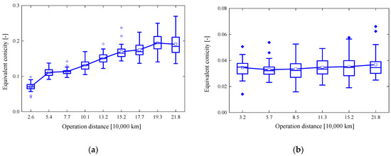 Figure 6 depicts the connection between equivalent conicity and operation distance for all 64 wheels in eight cars of a single train. Figure 6a shows that the equivalent conicity of the Line A gradually rises monotonically, and the increasing rate of equivalent conicity is about 0.006/10,000 km. The average statistic conicity starts from 0.07 and ends at 0.19 in one re-profiling cycle. However, the equivalent conicity is relatively stable for the Line B at about 0.03 in a whole re-profiling cycle, as shown in Figure 6b. As the wide range of wheel tread wear, the equivalent conicity does not increase.