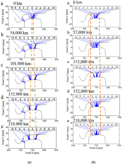 Wheel wear in one re-profiling interval: (a) Line A; (b) Line B.
