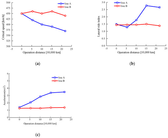 Vehicle dynamics index. (a) critical speed; (b) lateral ride index and (c) carbody acceleration.