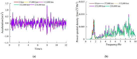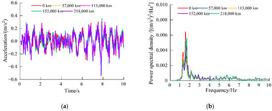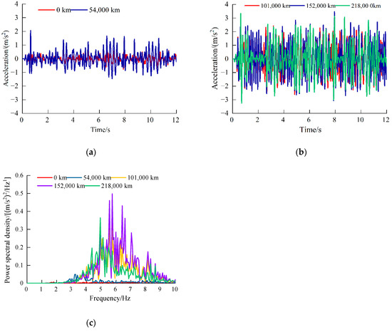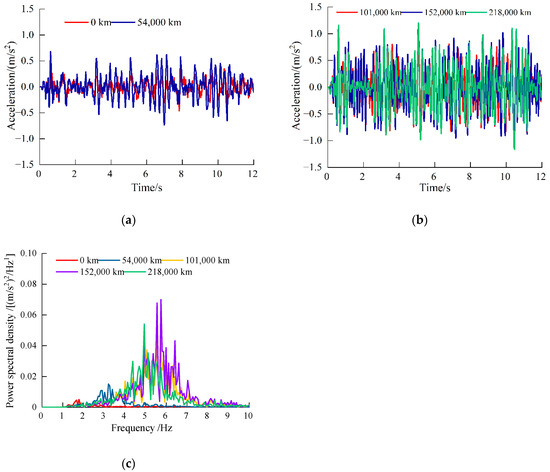 Vibration on carbody ends for the Line A: (a) time-domain of the service distance less than 54,000 km; (b) time-domain of the service distance more than 101,000 km;(c) frequency domain.