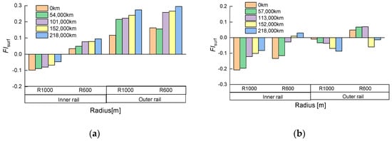 The influence of RCF on vehicle dynamic performance is investigated here, where two different curve radius 1000 m and 600 m are chosen here, and the track irregularity is not considered in the calculation. The rolling contact fatigue index of the outer and inner rail for the guide wheel is shown in Figure 15. As shown in Figure 15a, the FIsurf is positive in the inner rail with a curve radius 1000 m, this may lead to the rolling contact fatigue cracks on wheel surface. This is caused by the fact that the lateral wheelset displacement on the curves is about 9 mm, and two contact points occur on the outer rail, where one of which occurs at the flange. Consequently, the FIsurf of the outer rail is larger. The normal force and contact area diminish to a considerable amount as wheel wear progresses, therefore the surface fatigue index rises. In addition, Figure 15b illustrates that the FIsurf of the radius 1000 m is negative, while the FIsurf of radius 600 m is positive. This indicates that the possibility of the wheel forming rolling contact fatigue crack on the curve with radius 600 m is slightly greater than that of the radius 1000 m. Furthermore, the FIsurf progressively rises with wheel wear, especially the running distance is greater than 152,000 km, the FIsurf changes from negative to positive, and the possibility of rolling contact fatigue crack increases under long-term action.