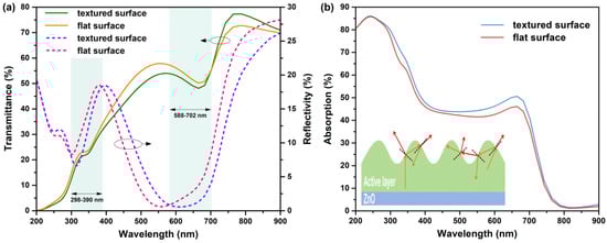Our previous work provided preliminary experimental confirmation of the light-trapping effect of SANR structures, but a more comprehensive insight into their light-trapping characteristics was still necessary. It is challenging to experimentally carry out this work, so we used the FDTD algorithm to carry out prior simulation research on the light-trapping characteristics of SANR structures. The transmission and reflection spectra of the ternary blend film with SANR structures (textured surface) are shown in Figure 3a; compared with the ternary blend film without SANR structures (flat surface), the textured surface can significantly reduce the photons’ transmittance in the wavelength range of 400–600 nm and the photons’ reflectivity in the wavelength range of 600–900 nm. Although there was an increase in the photons’ transmittance and reflectance in some wavelength ranges, the overall light-trapping effect was positive. A simultaneous decrease in the photons’ transmittance and reflectance occurred in the wavelength ranges 298–390 nm and 588–702 nm, creating an effective trap for the photons. The absorption spectra obtained by 1–R–T extrapolation are listed in Figure 3b, where the photon absorption capacity of the textured surface is significantly improved, especially in the above-mentioned wavelength ranges with significant light-trapping effect. As illustrated in the inset in Figure 3b, the presence of SANR structures leads to the formation of a rough textured surface, which can increase the number of reflections and refractions of the photons at the surface, thereby increasing the optical path length of the photons in the active layer and the probability of being absorbed [].