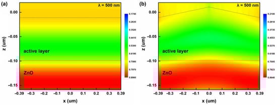Figure 4 presents the cross-section images of the electric field intensity |E|2 distribution at incident wavelength of 500 nm for the blend films with flat and textured surfaces. The results illustrated that the presence of SANR structures can influence the optical field distribution of incident light within the PTB7-Th:PC70BM:PC60BM blend active layer, especially near the interface between the active layer and ZnO, and more high-energy photons are trapped near the interface, indicating that the absorption of the incident light energy is enhanced in the active layer []. In addition, the results revealed that the light-trapping effect of SANR structures does not depend on the direction of photon incidence. In the results in Figure 3, the photons are incident from the ZnO layer, while in the results in Figure 5, the photons are incident from the top of the active layer. It can be seen from the absorption spectra that the photon absorption of the active layer is similarly significantly enhanced, especially for the photons in the 500–700 nm wavelength range.