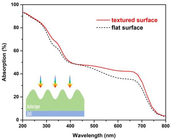 Absorption spectra of the blend films with textured and flat surfaces. The photons are incident from the top of the active layer as demonstrated in the inset.