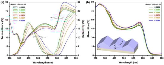 (a) Transmission and reflection spectra of the textured surface with different aspect ratios of the SANR structures and (b) corresponding absorption spectra. The inset demonstrates the structural parameters of the numerical model: the width was fixed at 780 nm and the height was changed, thus changing the aspect ratio.