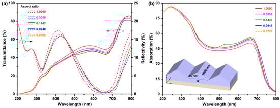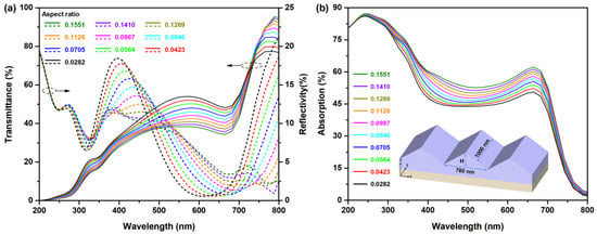 (a) Transmission and reflection spectra of the textured surface with different aspect ratios of the SANR structures and (b) corresponding absorption spectra. The inset demonstrates the structural parameters of the numerical model; the specific values are listed in Table 1.