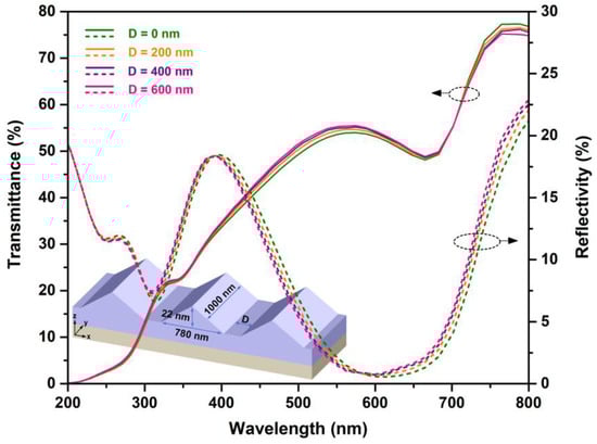 Finally, attention was paid to the effects of the distance between adjacent SANR structures on the photon absorption capacity. The numerical model is illustrated in the inset in Figure 9, where the width, height, and length of the SANR structures are 780, 22, and 1000 nm, respectively. The distance between adjacent SANR structures is D, which takes the values of 0, 200, 400, and 600 nm, separately. The corresponding transmission and reflection spectra are displayed in Figure 9. Compared with the height and width of the SANR structures, the variation in the distance between adjacent SANR structures has less effect on the transmission and reflection spectra of the active layer. In general, the smaller the spacing between adjacent SANR structures, the more favorable it is to reduce the transmittance and reflectivity of the active layer for the photons in the specific wavelength ranges. When the spacing is zero, the photon absorption capacity of the active layer is optimal. Based on the simulation results, we inferred that in the PTB7-Th:PC70BM:PC60BM blend film with SANR structures, increasing the number of the SANR structures per unit area (surface density) helps to improve the photon absorption of the active layer, which is consistent with the results in Figure 6.