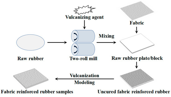 The preparation of PET/rubber composites, shown in Figure 1, was as follows.. The composition of the rubber compound, shown in Supplementary Materials Table S2, was used in our study. The weighed rubber compound was put into a two-roll mill, in which rubber sheets, with a thickness of 2 mm, were obtained by adjusting the space of the two-roll mill. Then, the rubber sheets were cut into the same size as the fabric, 25 × 25 cm2. Finally, the fabric was carefully laid between the two rubber sheets to form a sandwich structure composed of 1 layer of fabric between2 layers of rubber sheets. The uncured fabric reinforced rubber composites were placed into a 23 × 23 × 10 cm3 stainless steel mold and vulcanized at 150 °C for 40 min under 15 MPa.