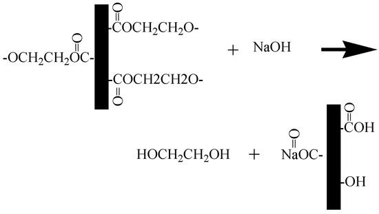 In order to analyze the influence of alkali treatment and grafting coupling agent on the strength of the fibers an analysis of the multifilament tensile strength of the PET fibers was performed. Figure 2 shows the relationship between treatment process modes and tensile strength. It was revealed that the tensile strength of fibers decreased with alkali treatment, while it increased when KH550 was grafted on the fibers. When the fabrics were immersed in alkali solution, ethylene glycol and sodium terephthalate were generated under the hydrolysis of the surface of the fabric [11,12], leaving the OH, -COONa and -COOH groups on the fabric surface. The reaction process is shown in Figure 3. Compared to the untreated fiber, the tensile strength was decreased by the NaOH solution treatment, indicating some damage of fibers and causing a loss of tensile strength. From our results, shown in Figure 2, the tensile strength of fibers inversely recovered a little after KH550 treatment. Since the grooves and holes etched by the alkali solution could be embedded by the polymer molecules, they could be partly repaired (as shown in Figure 4), reducing the probability of stress concentration and avoiding fiber breakage.
