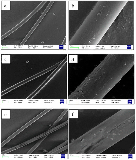 SEM images of fabric samples. (a,b) original fabric; (c,d) NaOH-treated fabric, (e,f) KH550-grafted fabric.