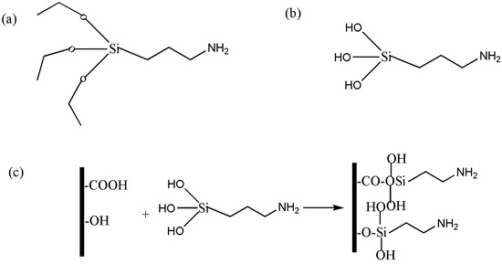 (a) chemical structures of KH550; (b) Schematic illustration of the hydrolysis of KH550 and (c) the reaction of KH550 with fabrics.