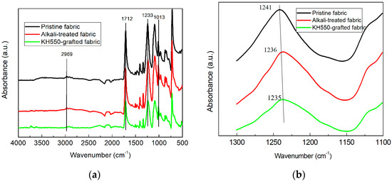 FTIR of the fabrics treated by various process modes are shown in Figure 6. The absorption peaks located at 1233 and 1013 cm−1 were due to the stretching vibration of the C–O–C group, and they were characteristic peaks of ester groups. The peaks at 1712 cm−1 and 2969 cm−1 were attributed to stretching vibration, which was caused by groups of C=O and –CH2–, respectively. The –CH– in the benzene ring bending vibration peaked at 745 cm−1 [14,15]. The C-O of the polyester fabric changed from 1241 cm−1 to 1235 cm−1 after the alkali and KH550 coupling agent were added, shown in Figure 6b. It may have been the result of the hydrolysis of ester groups and grafting coupling agent treatment [10].