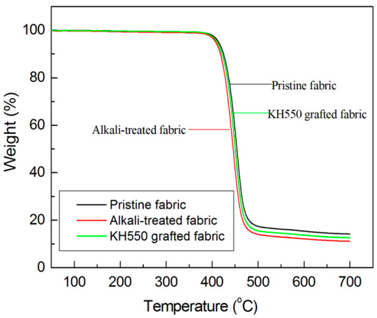 Figure 7 shows the TGA analysis of the pristine fabric, NaOH-treated fabric and KH550-grafted fabric. The residue rate of the pristine fabric was 14.1 wt%. In this temperature range (room temperature to 700 °C), the PET fabric showed large decomposition. After NaOH solution treatment, the residue rate of the NaOH-treated fabric was 11.1 wt%, because both severe surface hydrolysis of the NaOH-treated fabric and the resulting -OH and -COOH groups decomposed easily. The residue rate of 13.2 wt% was obtained after KH550 treatment, and the grafting rate of KH550 on the fabric surface was 2.1 wt%. This also confirmed that the KH550 molecules had been successfully grafted onto the fabric surface.