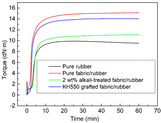Vulcanization curves of samples (Pure rubber, Pure fabric/rubber, 2 wt% alkali-treated fabric/rubber, KH550 grafted fabric/rubber).