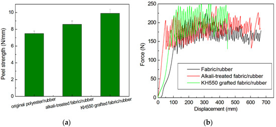 The interfacial adhesion of the fabric/rubber composites was tested by the peel strength. The peel strength of the fabrics under different treatments are shown in Figure 9a. The peel strength of the KH550 grafted fabric/rubber composites was higher than the others when the fabrics were modified by the KH550, which caused an increase of 32% compared with that of the original fabric composites. The peel curves of fabrics treated with different fabric surface treatment are shown in Figure 9b. It was also obvious that the KH550 grafted fabric treatment could effectively improve the interfacial bonding. In addition, the curves of the alkali-treated fabric/rubber composites had greater modulus and more fluctuations than the other peeling curves. The interfacial adhesion and the fabric shrinkage deformation could affect the peel strength [17]. Obviously, the alkali-treated fabric could be easily deformed because the alkali-treated fabric was damaged to some extent.